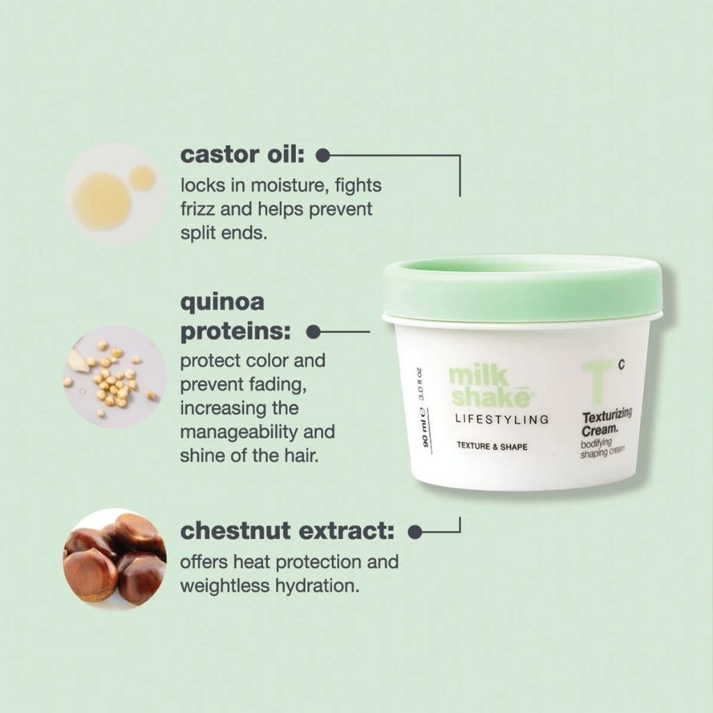 Milkshake Lifestyling Texturizing Cream is a versatile styling cream designed to enhance natural texture while delivering soft definition and flexible hold. Perfect for effortless, lived-in styles, this lightweight formula adds body, separation, and movement without weighing hair down or leaving residue.