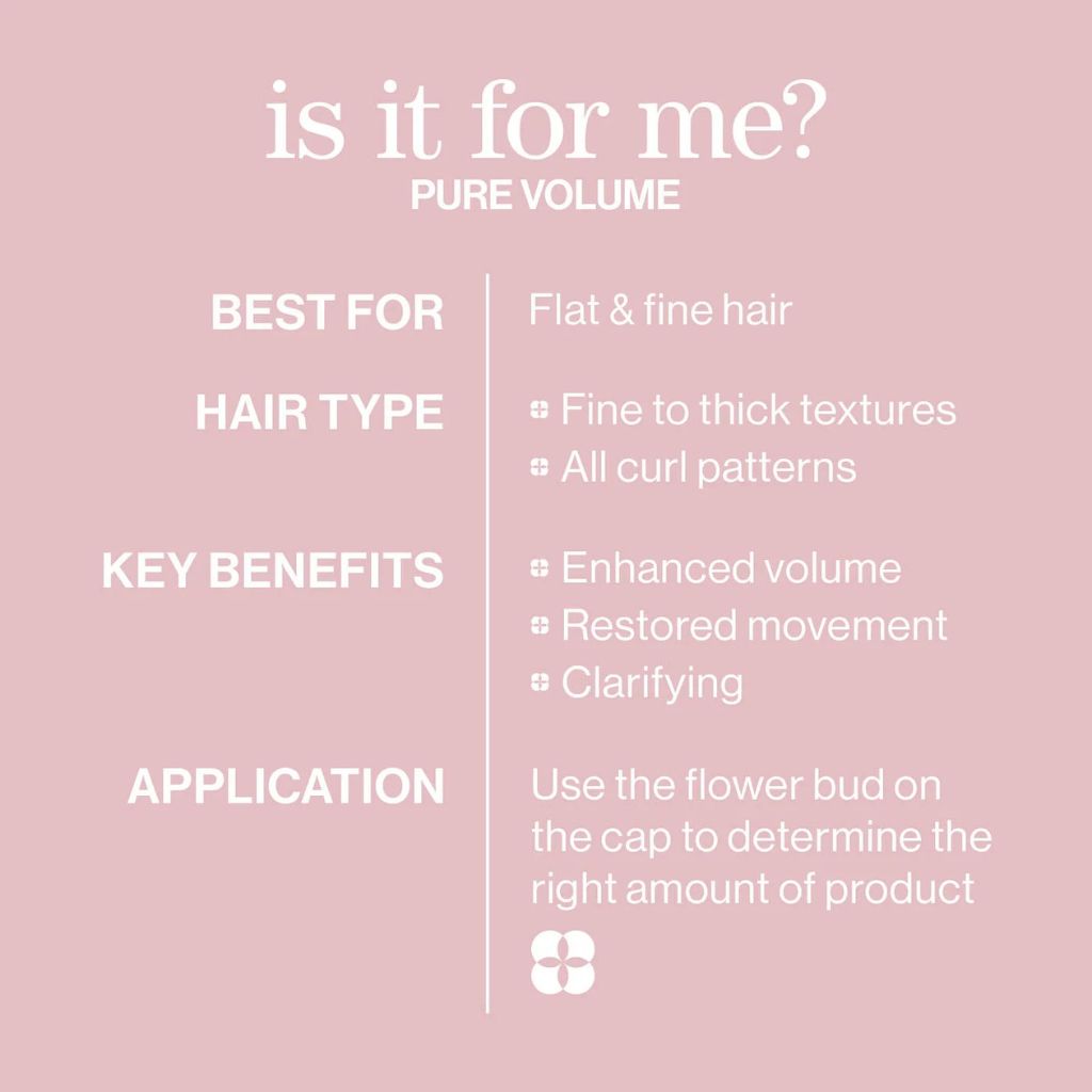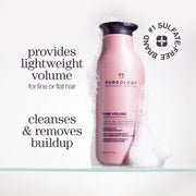 Pureology Pure Volume Shampoo enhances volume and restores movement to flat, fine color-treated hair with key ingredients Wheat Protein and Eucalyptus Leaf Extract and a signature aromatherapy blend of Pink Grapefruit, Wild Rose, and Cedarwood.
