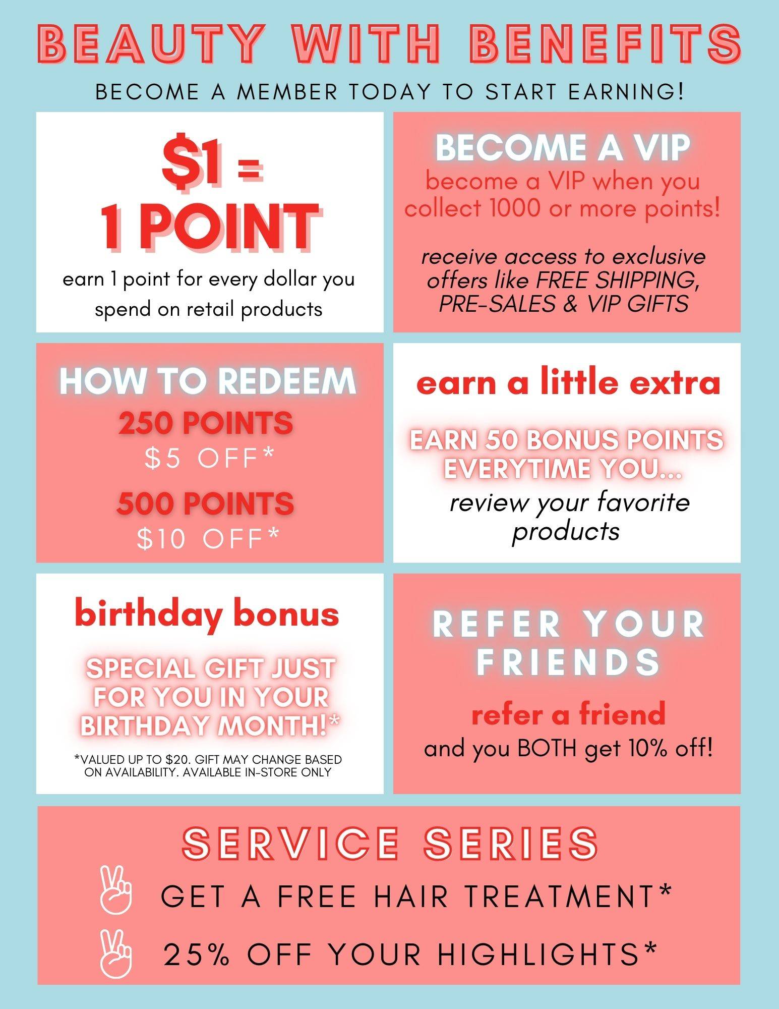 - BWB SERVICE REWARDS - Book in for 4 hair cuts to be eligible for free hair treatment on 5th visit.